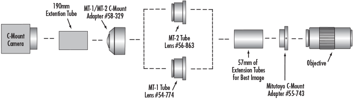 七元件的设置可能有点棘手,但以下说明将帮助使设置过程更简单。开始时,可以打开#58-329 MT-1/ MT-2 C接口适配器,内可安装MT-1或MT-2管透镜。由于管透镜本身没有螺纹,该适配器 的两侧提供了必要的C螺纹。在适配器和C接口相机之间,需要另外一个190mm加长套管。由于管透镜不直接连接到物镜,请在C接口10mm适配器使用#55-743Mitutoyo连接物镜(此适配器添 加了10mm的长度并将M26螺纹接到C螺纹)。在管透镜和物镜之间的另外一个76.5mm空间是佳的,但因为每个适配器均添加了约10mm的空间,它一般只使用介于#55-743和#58-329之间约56.5mm的空间。利用这个56.5mm的空间,就可使用加长套管或添加其他光学元件,例如分光镜、光学滤光片、偏光镜等。