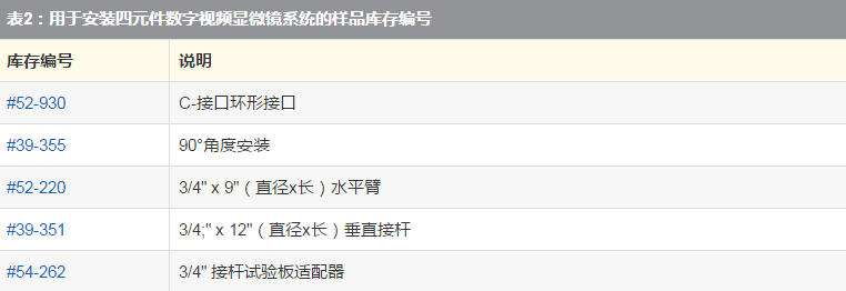安装四元件数字视频显微镜系统与装配元件一样简单。取决于观测物体,配置可以垂直或水平安装;细胞和生物样品通常要求垂直方向以确保样品或液体不会溢流。此外,可以使用任何长度的接杆或接杆固定器。作为出色的入门系统,请考虑使用在图3和表2中列出的库存编号。