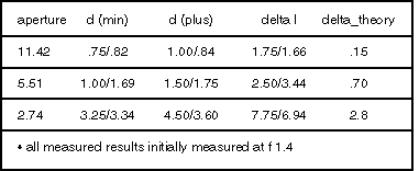 The values below highlight a number of points to consider. In general our calculated and measured delta d are fairly close. However, the displacement of the image due to defocus aberrations was not predicted by our calculations. This type of displacement error could certainly be problematic if the system contained an auto iris. If we compare our measured results to the delta-theory, we notice a significant variation. As we mentioned earlier, this variation is due to a false assumption concerning system resolution.