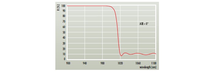 •在808nm-990nm处的透射率T> 99%,1030nm处的反射率R> 99.9%,即从高透射率范围向激光波长的4%内的高反射率范围的转变