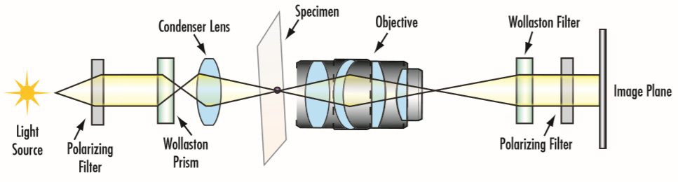 DIC 显微镜使用偏振镜和双折射的渥拉斯顿或诺玛斯基棱镜将光源分离成两个正交偏振光(图 5)。物镜将这两个器件聚焦到样本表面,而样本表面的位移距离等于显微镜的分辨率。经过准直透镜准直后,再用另一个渥拉斯顿棱镜将这两个器件重新组合。然后合束光再通过后者偏振片(也被称作分析器),该偏振方向与前者偏振片垂直。由于两个器件的光程长度的不同而产生的干涉会导致可见亮度发生变化。
