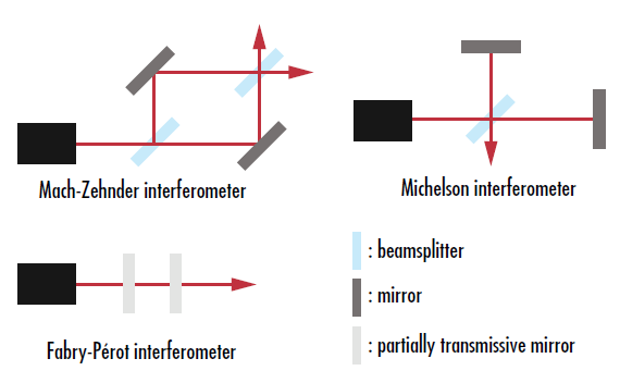 有几种常见的干涉仪配置(图 8)。马赫-曾德尔干涉仪利用一个分束器将输入光束分离成两条不同的路径。后者分束器将这两条路径重新组合成两个输出,然后发送到光电探测器。迈克耳逊干涉仪使用一个单波束分离器来分割和重组光束。迈克耳逊干涉仪的一种变体是特曼-格林干涉仪,它以单色点源作为光源来测量光学元件涉仪通过使用两个平行的部分透明反射镜,而不是两个分离的光束路径来实现光的多次往返。