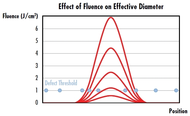 图 2: 高斯光束的有效直径随能量密度的增加而增加,并导致激光诱导损伤的概率升高,表现为能量密度大的曲线宽度下的损伤点更多