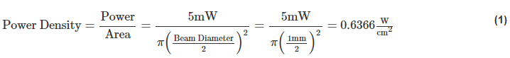 要了解 CW LIDT 规格,必须了解激光器的波长、光束直径、功率密度和强度分布(如高斯或平顶)。CW 激光器的 LIDT 表示为单位面积的功率,通常用 W/cm2 表示。例如,如果使用 5mW, 532nm Nd:YAG 激光,且平顶光束的直径为 1mm,则功率密度为:
