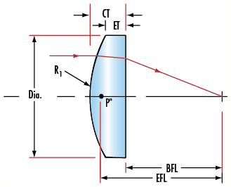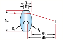 P, P" | 主平面 – 一个假设的平面,其中入射光线可以被认为是由于折射而弯曲的。 EFL 是从主平面位置定的。 |