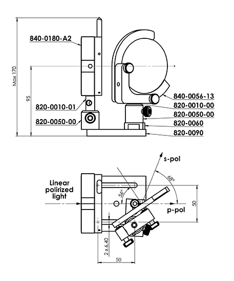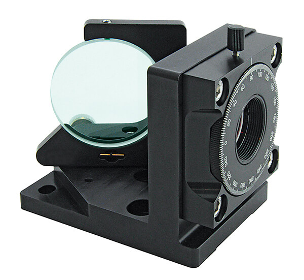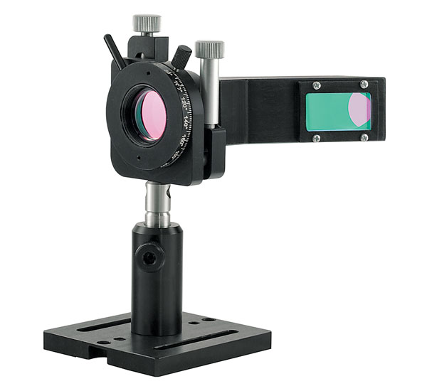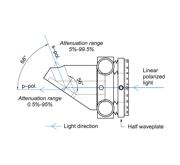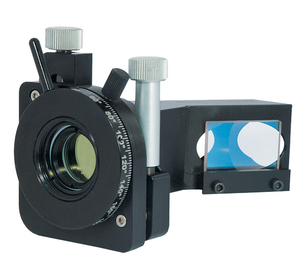 该可变衰减器/分束器由用于56°840-0117A或840-0118A偏振器的特殊设计的光学机械适配器和精密光学机械支架840-0197组成。薄膜布儒斯特型偏振器反射56°的s偏振光,同时透射p偏振光,它装在56°偏振器的适配器中。石英半波片容纳在旋转支架840-0197中。